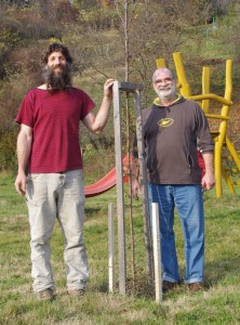 A fák közül 3-at ismét azért kellett cserélni, mert a gondatlan fűkaszálás teljesen megölte őket tavaly óta. A többin is mind láthatók külsérelmi nyomok – reméljük az új csirkehálós favédelem új esélyt ad fiatal fáinknak!