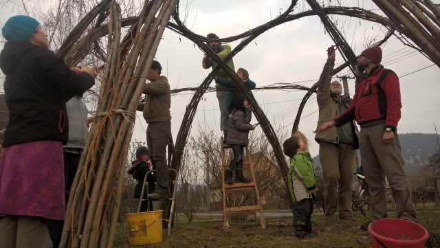 • A fűzfakunyhó metszése, azaz a vastagabb ágak befonása a vázba, a vékonyabb ágak levágása