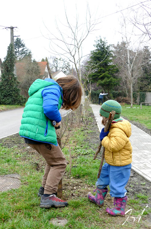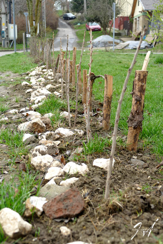Vége a télnek. A befőttesüvegeket eltávolítottuk. A gondos segítők minden új dugványozott ribizli és jósta tövet elláttak cserébe két oldali karókkal, védve a pici hajtásokat a fűkaszák, labdák és szaladgáló gyerekek veszélyeitől.