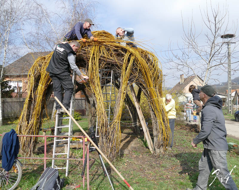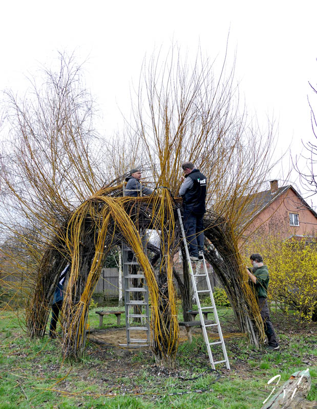 A fűzfakunyhó egy év alatt masszív, 3 méteres hajtások tömkelegét hozta. A vesszők lekötözése, visszavágása, összefűzése komoly szervezési és fizikai erőt is igénylő feladat: