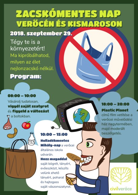 - 18:00-20:00 Dokumentumfilm vetítés a Verőcei Művelődési Házban, majd moderált beszélgetés (ma Zacskómentes Nap, holnap Zacskómentes Föld!)